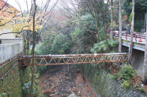 箕面川橋から下流を見ます。 いい感じに錆びた配管用のミニトラス橋が あります。 |