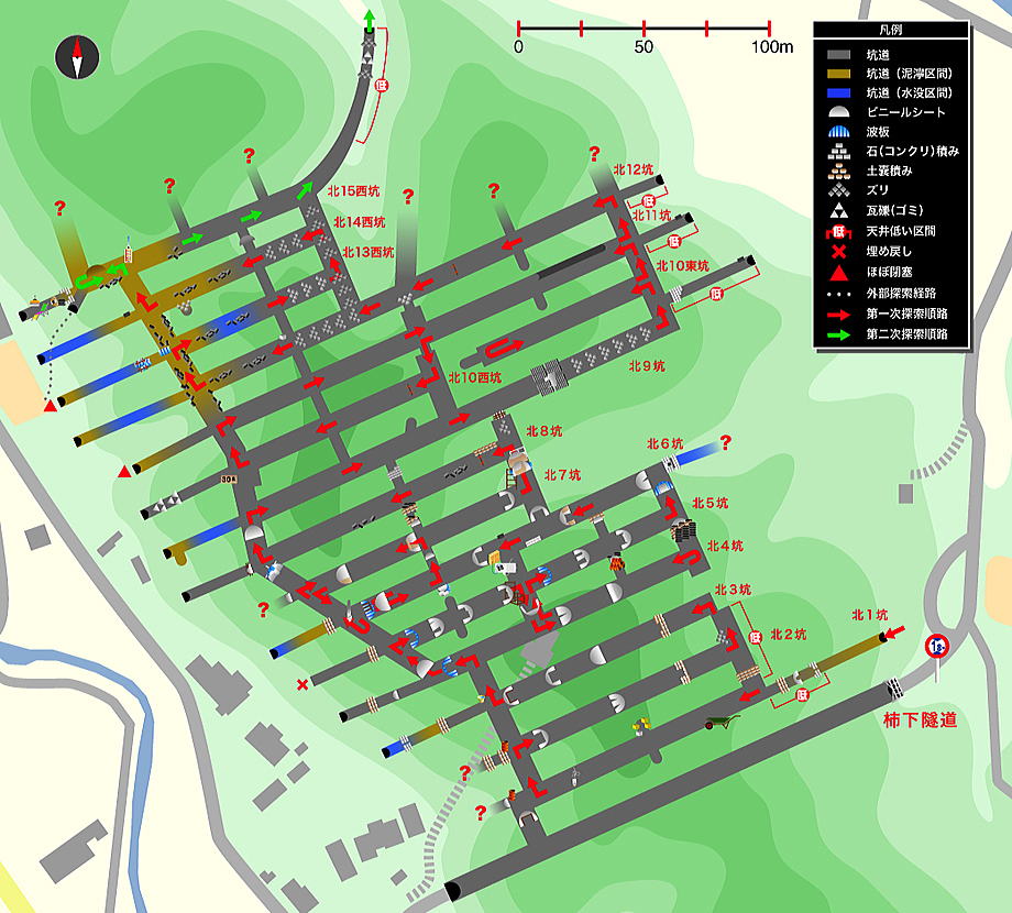 ![]() 第二部は駐車場所を変更し、未探索の個所からの突撃を敢行しました。 途中となっていた北15西坑と謎の天井通気口?を探索、東進し、またまた謎の左カーブ から謎の坑口に達しました。 次回は謎の坑口外の状況からのスタートです! 以降、 その11 に続く! |