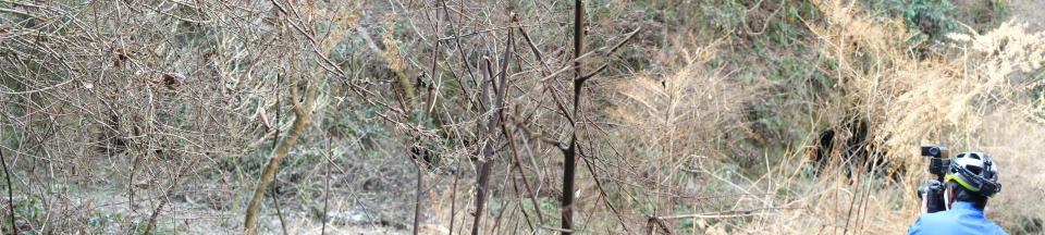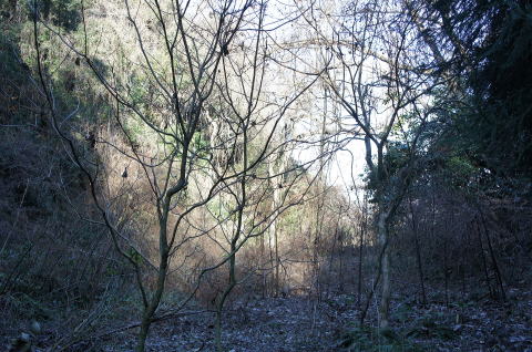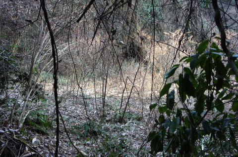 うむ。鬱蒼である。。。 これが夏場だととんでもないことになるのは この冬枯れの時期でもはっきりと分かります。 前回はここをまっすぐ、方角的には北方面に 向かい脱出しました。 ここはちょっとした平場になっており、雑草 木々が茂ってなければ結構広いスペースのよ うに感じます。 |