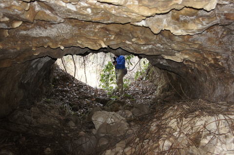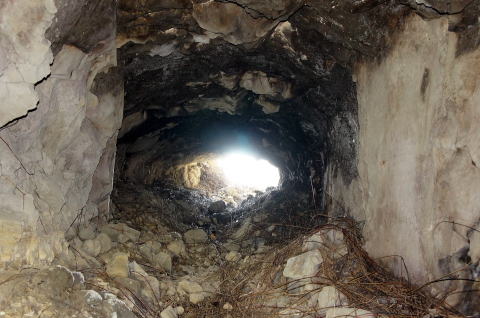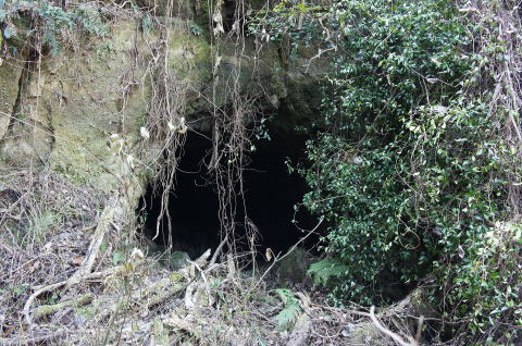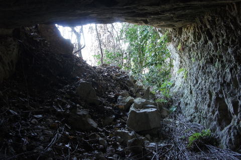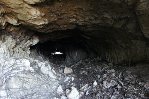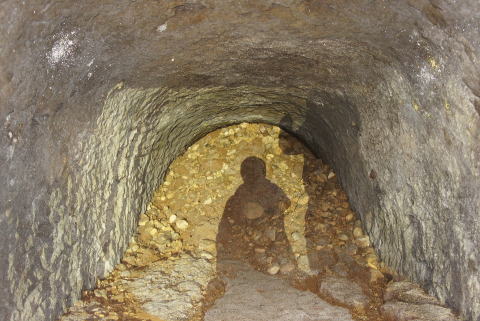 東側坑口付近はやや高さがあります。 右のカベがなんか怪しく見えますが、どうも 自然のもののようです。 ここには横穴はなく、1本隧道として存在し ました。 |