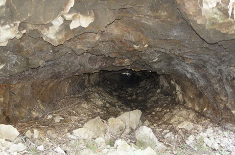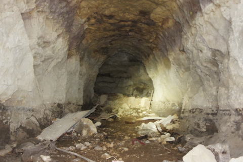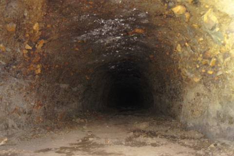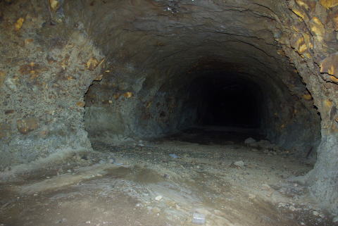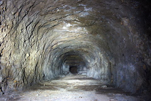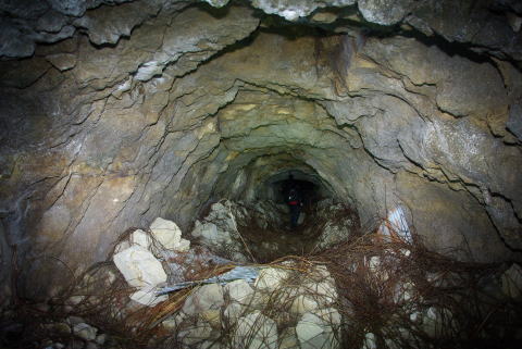 その南側横坑から振り返って、北側の坑口を 臨みます。 。。。うーむ。。。先が長い。。。 画像では先で丁字路みたいに見えますが、 微妙にいがみつつもずーーーーっと先が続いて います。。。 |