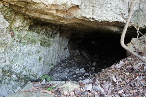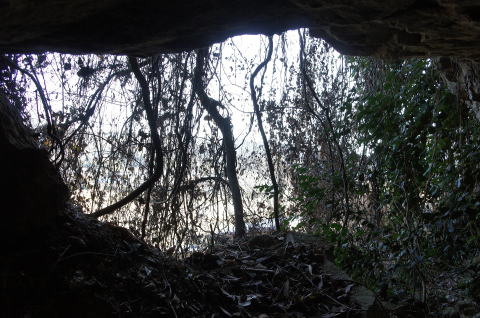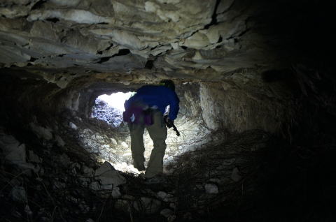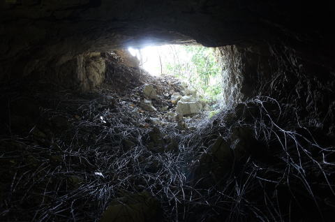 出てきた穴を振り返り。 うーむ、不気味だ。。。 で、この穴の向きですが、やはりおおよそ北 を向いているように感じます。やや北東寄りで しょうかね? 北15西坑を東進していたんですが、出てきた らおよそ北を向いていた。ってことで洞内は 45度以上曲がっていたということですな。 |