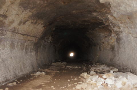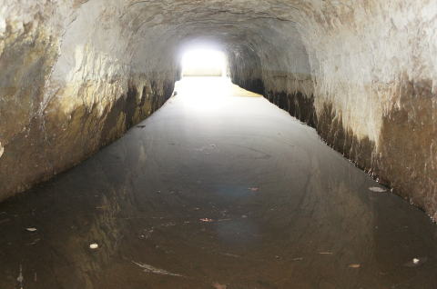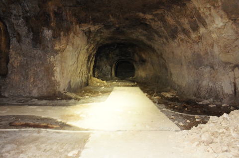メイン横坑に戻ってきました。 コンクリートのラインが流麗ですなあ! |