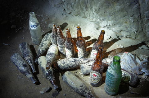 十字路を過ぎた辺りの右隅に大瓶群が放置 されていました。 サッポロさんにスプライトさんにファンタさん ですな。 |