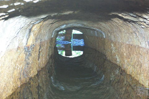外側から覗きました。 やや左側が膨らんでいる個所がありますな あ。 水はだいぶ澱んでいる感じがします。 |