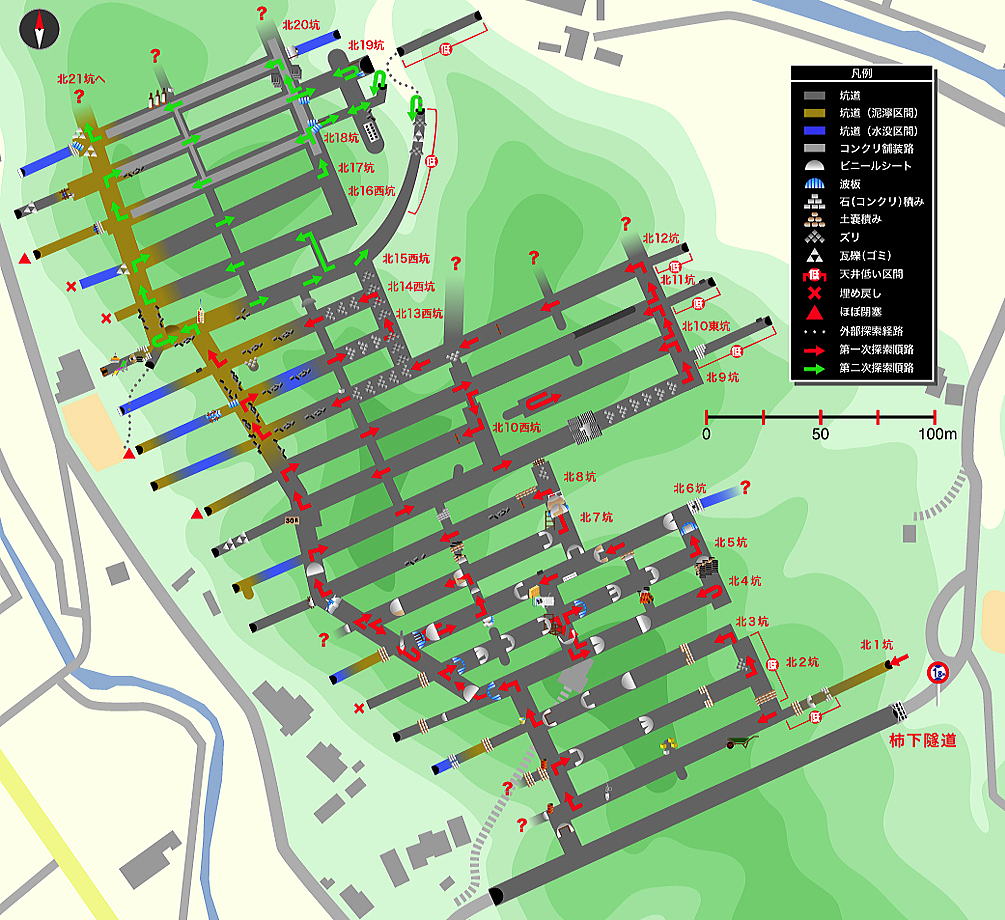 ![]() 今回は北19坑西側坑口方面から東側坑口脱出。再入洞して北20坑へ。両側水没する坑口の 確認を致しました。 次回は北21坑からですよ〜。一体いつまで続く、北坑よ! 以降、 その14 に続く! |