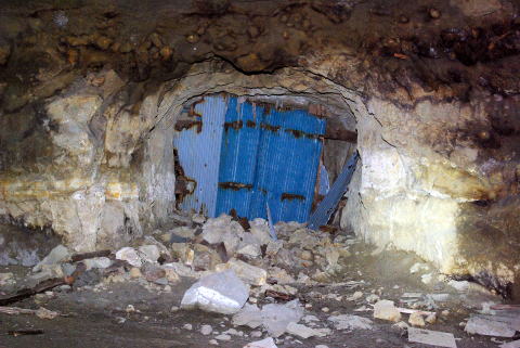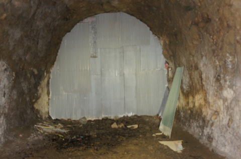 さあさあさあ! 北24坑西側坑口に辿り着きました。 そろそろ大詰めですねえ。 ここの坑口は波板封鎖でしょうか? |