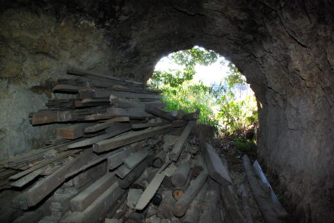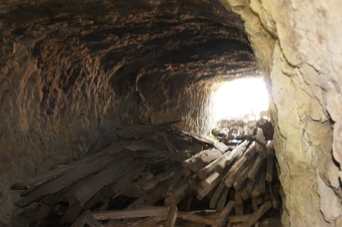 隙間から撮影。 内部は角材で埋め尽くされています。 普通に開口していますな。 しかしここから外に出る気にはなれません ので、少し戻って脱出しようと思います。 |