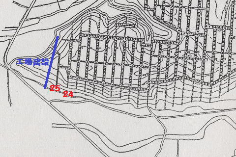 北坑端点、北25坑の線形は、まさに計画図 通りでしたな。 埋められていた北25坑の北東坑口は、後年 できた工場の敷地確保に削られてしまった ようです。 実際青のラインで綺麗に法面加工されてい て、穴の痕跡は見られませんでした。 |
