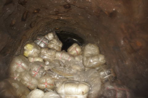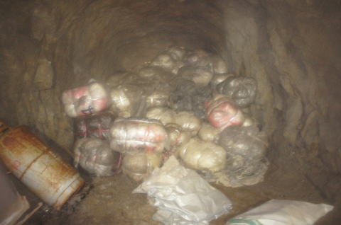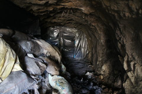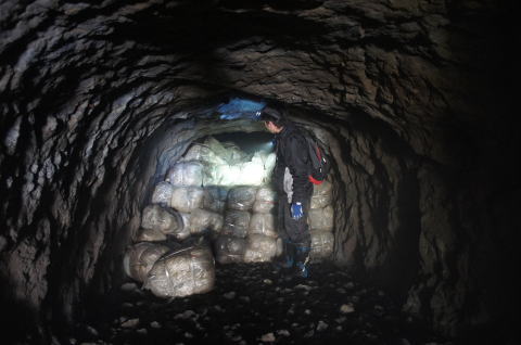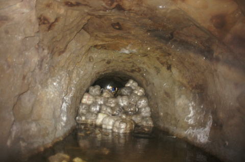 一か所目の土嚢を振り返り。 たっぷり充填されています。 外は北2坑の本坑でございます。 |