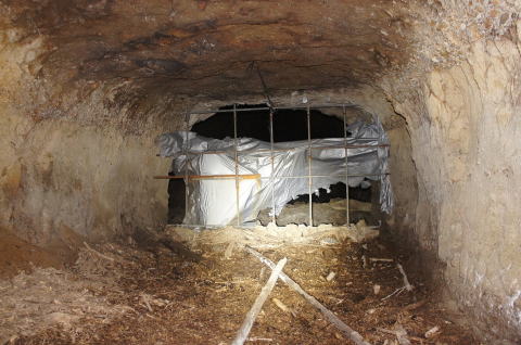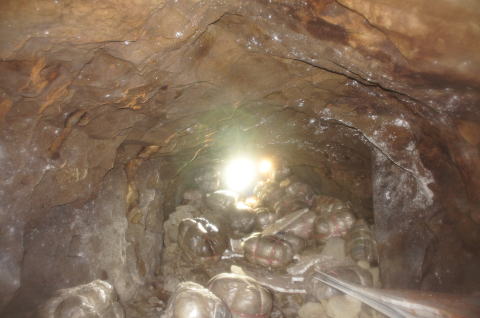 土嚢を乗り越えてから振り返り。 左手のボンベは「その2」に映ってます! これで北3坑西側の坑道が繋がりました! |