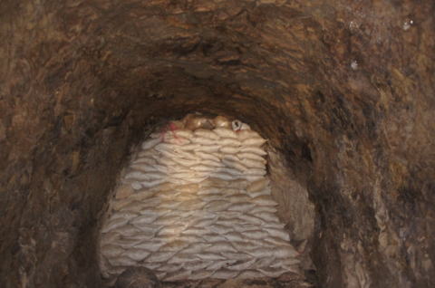 西側坑口から柿下隧道土嚢もりもり。 天井までびっちりです。 でも右側に隙間があるんですよねえ。 |