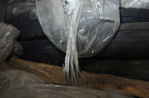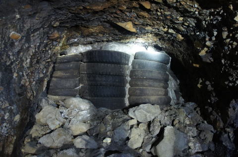これわあああああ。。。 間違いありません。北7坑の塞ぎ込み地点 です。 恐ろしく頑丈な塞ぎ方ですな。。。 瓦礫の上のタイヤを積んでいます。何故に こんな強固に。。。? |