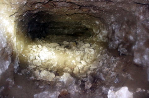 狭高!印象はそんな感じです。 上段、下段で掘り分けたような感じも 見受けられます。 しかしながらその様子は途中も途中。 床面には瓦礫が溜り、左手には木片が 刺さっているように見えます。 |