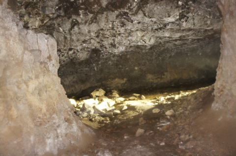 おお!?十字路か?と思いましたが、 右側は掘りかけのような凹み、左も同様 でした。 しかし、正面の穴がやや左にずれていま な。。。これが何を意味するか。。。 もしここが東側に貫通しているのだとした ら、ひょっとしたら両側から掘り進めていた 可能性があります。 それなら一致しなくても納得。 |