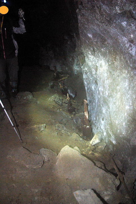 床面壁際に刺さる木片。 支保工の残骸でしょうねえ。 (写真提供:おろろん氏) |