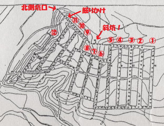 東坑の東側横坑を北進、端っこの坑口 まで到達しました。 トリッキーな行軍をしたお蔭で真中が 空洞になるという状況に。。。 まあ気を取り直して北側から攻めて 参りましょう。 |
