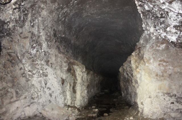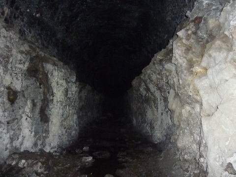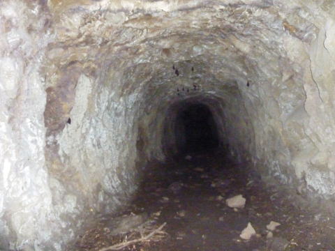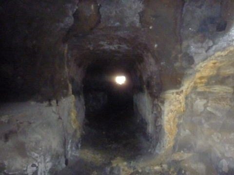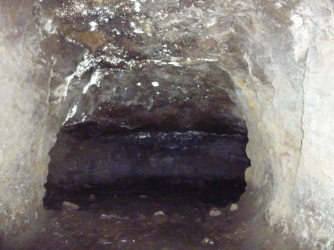 一方のこちらが正面の坑道。 これも東側横坑と思われます。 ちょうど斜坑に向かう坑道を避ける 形でコの字型に東坑を曲げたのでは ないでしょうか。 |