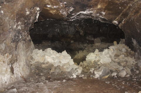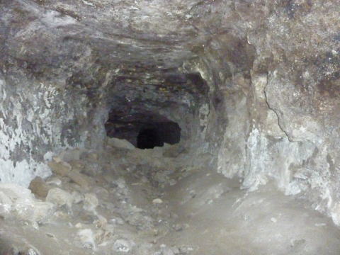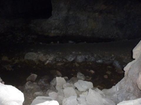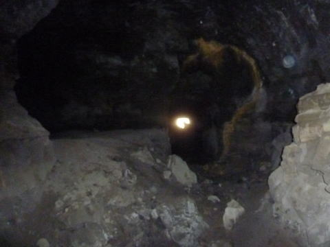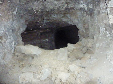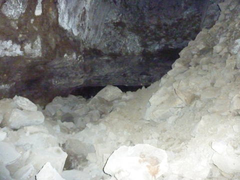 坑道は一気に窄まり、さらに瓦礫で 覆われてしまっています。 向こう側は東側横坑のはずですん で、寸前まで拡幅していたんですね え。 |