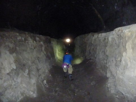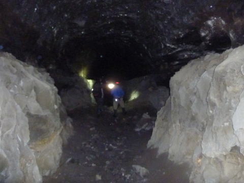 〜東8坑〜![]() ぬぅおっ!? なんじゃこりゃ〜!!!?思いっきり掘りかけやないか〜! でかい空間はできつつあるが、両端の掘り下げが思いっきり途中です。 二段掘りの教科書みたいな残り方です。この両端の部分だけでも背丈を超えます。 で、こっちは西向き、出口の光が見えますな。 (写真提供:おろろん氏)←ありがたい! |
