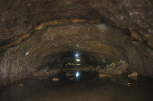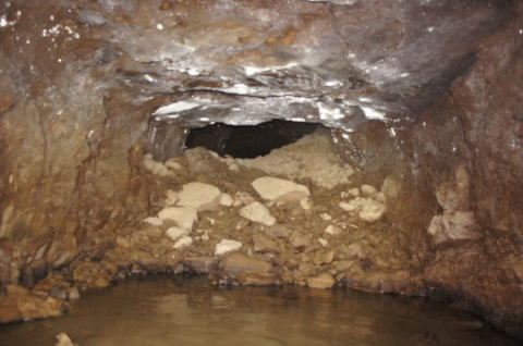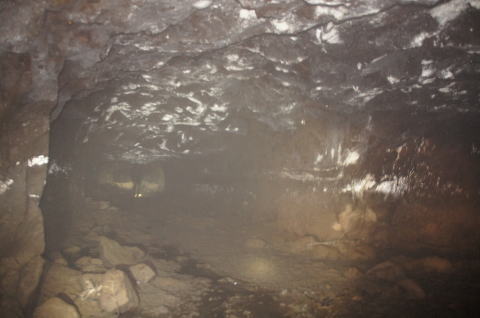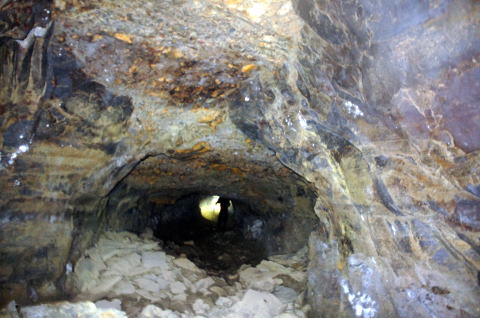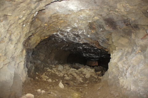 南3坑への横坑まで戻って来ました。 この南4坑の東側の坑口は奥に確認で きません。 が!なんか奥の壁面に光が反射してい ます。 この状況は何となく予測しています。 |