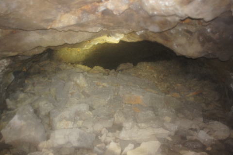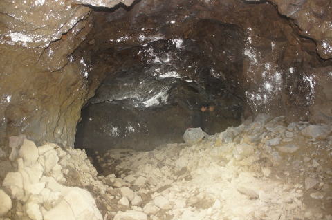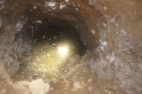 ![]() おお!分岐が現れました! 右手、1段広くなった横坑のすぐ先で分岐が現れました。 中央にズリが溜まっています。 奥はまた狭い横坑に戻ってますな。広げる途中って感じですな。 |