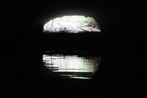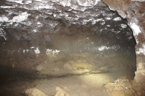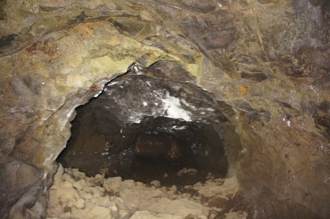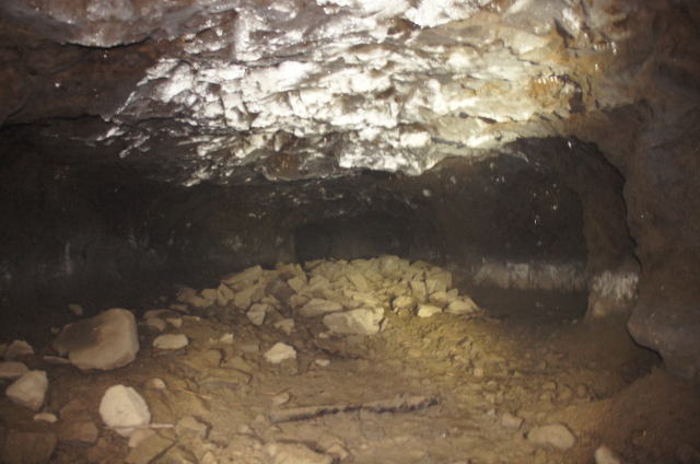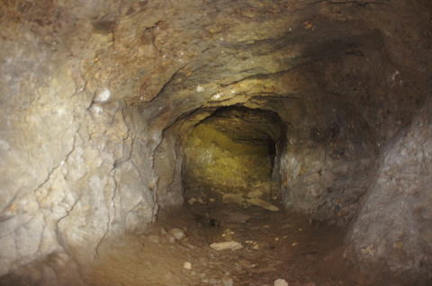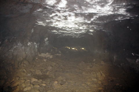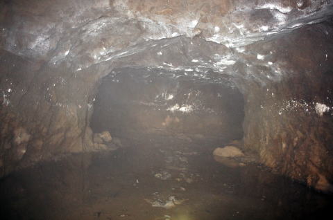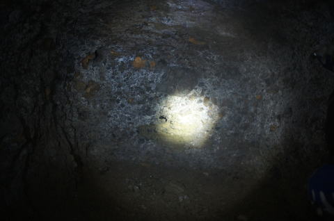 フラッシュなしで奥を撮影。 外の竹藪が見えますな。 背の低い坑口も見て取れます。 |