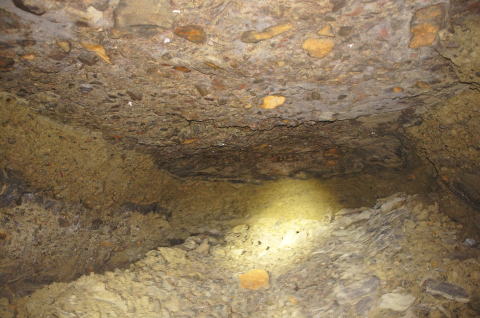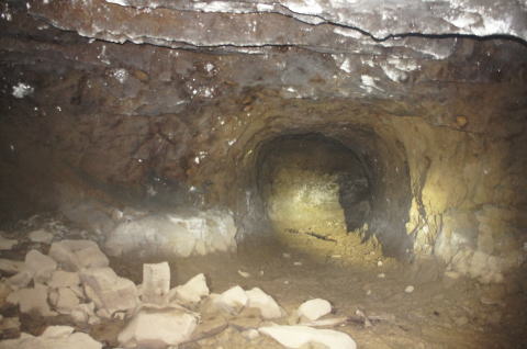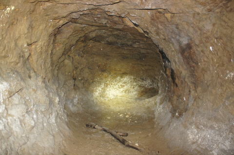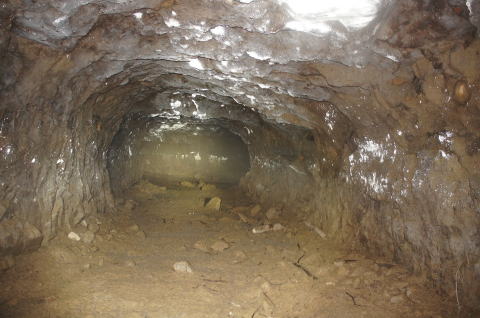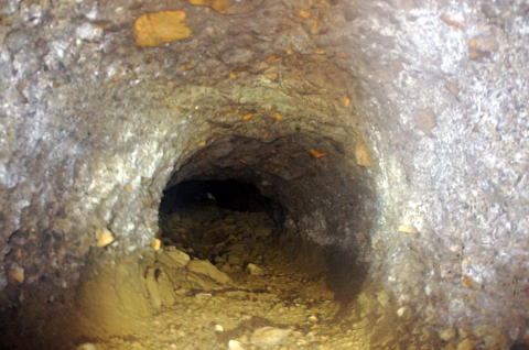まずまずの広さを持つ南4、南5連絡横坑 です。 東側掘削部隊のズリ排出路として大き目 に掘ってあるのかもしれません。 |