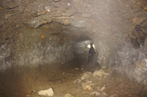 さてさて、早速分岐のあった方へ。 ここは南3坑と南4坑を繋ぐ横坑です。 ついに全く謎に包まれていた南4坑への 足がかりを掴みました。 この横坑は多少ぬかるんでいるものの、 水分は大分抜けています。そんな跡が見て 取れる床面です。 あ、ちなみに奥右に居るのはピカさんで す。 |