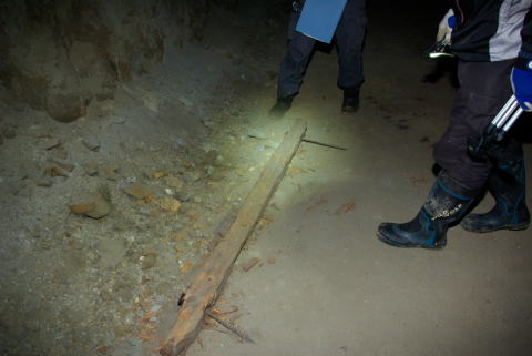 北12坑西進! するとまたもやこの遺構が。 角材と長めの釘2本で成り立っています。 これを天井に向けて打ち込んでいたんでしょ うか。 |
