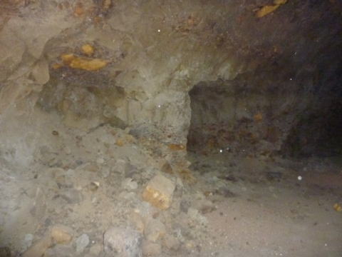 北13坑へ接続する、はずの横坑です。 うーむ、大分洞穴の様相を呈してきましたな。 |