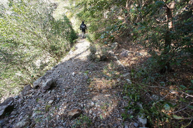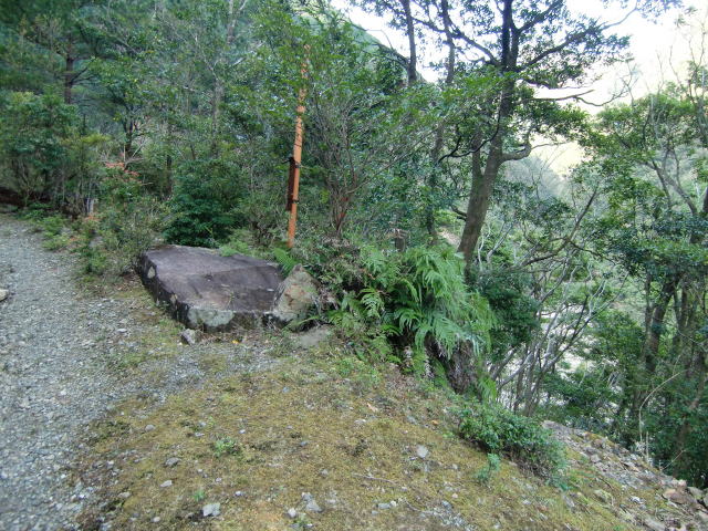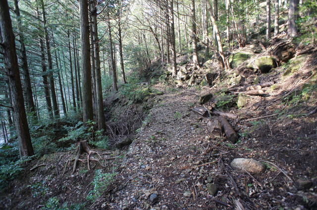 閑話休題! 駐車位置から少し戻った所にニノ俣林鉄へのアプ ローチポイントがあります。 mt.tellさんが座っている場所の右側に… ![]() 密かにこのような案内板が付けられておりました。 樫山は対岸の958mの急峻な山です。この場所の 標高が255mなので、高低差が700mもあります。 あな恐ろしき登山道… 当然、そんな所には逝きません。まずはここから40 m程降りて、川床に向かいます。 |
