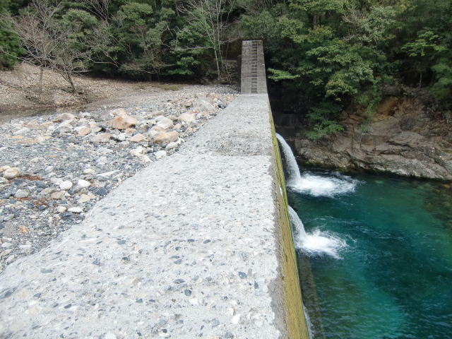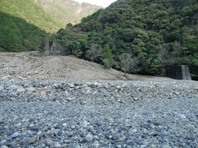 2010年3月 川床まで降りてみるとこの有様です。 夥しい量の石ツブテで砂防堰堤が完全に埋まって おります。 8年前からこの状態です。2011年9月の紀伊半島大 水害では銚子川も避難判断水位を超えたそうですが、 その前からこの状態ということになります。 |
