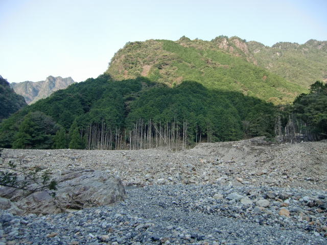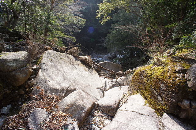 橋梁があったと思われる川床から銚子川方面を見ま す。 でっかい岩が散乱しております。 |