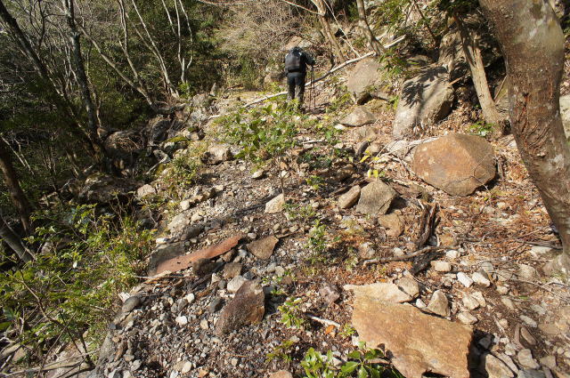 2010年3月 この通り、水が全くありません。 地理院地図の青々とした水表記とのギャップが凄 い… で、何で2010年の画像ばっかりやねん、て感じです が、この辺の写真全く撮ってなかったもんで… 2018年2月では瓦礫の山が少し大きくなっておりまし た。 さあ、水無し湖を横断し、対岸に向かいます。 |