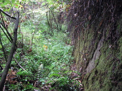 旧線跡の路面が斜面に遮られ、当然そこにあって然る