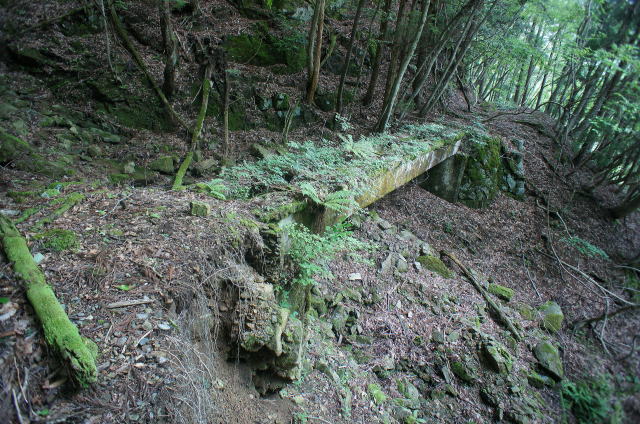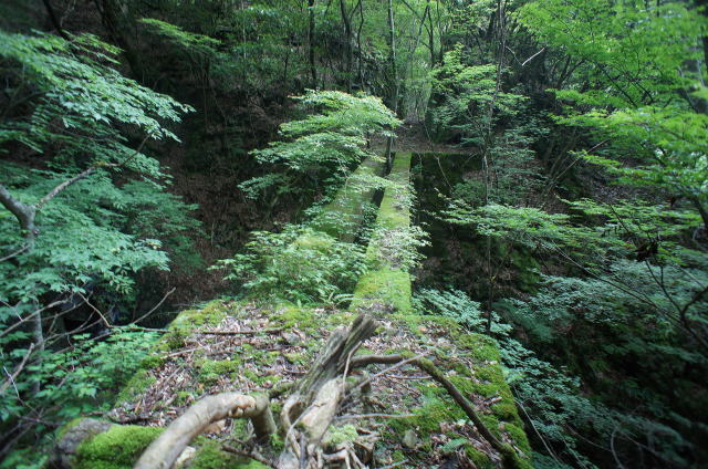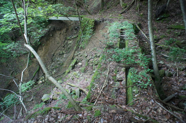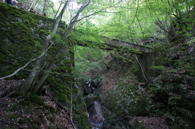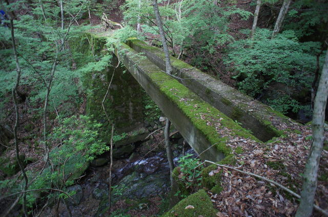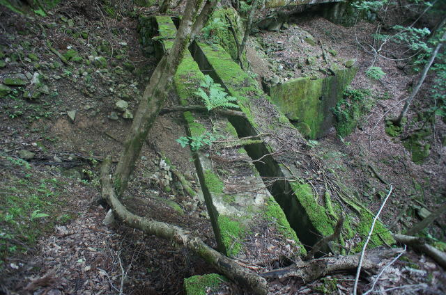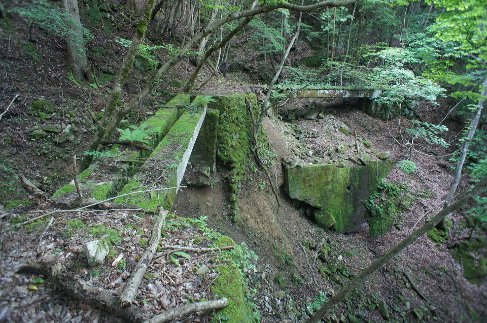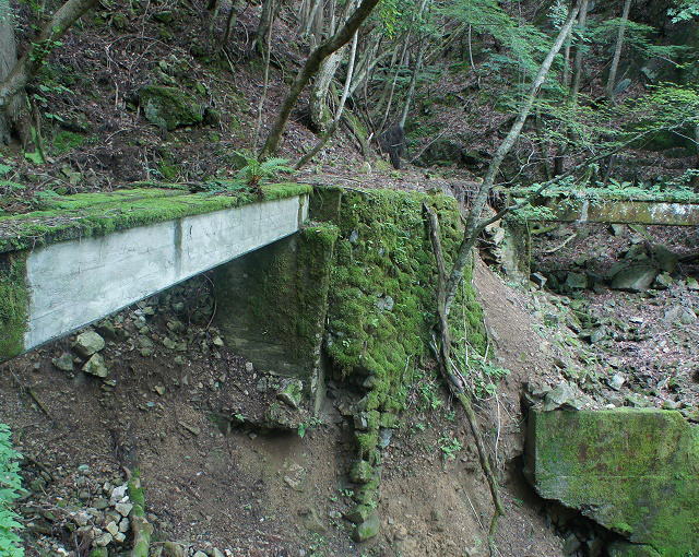 ![]() で、今立っているこの中洲のような場所、元の場所から見ると橋台はコンクリ、中洲は石積みで造られていることが分かります。 でで、探索時は知らなかったんですが、帰って著書林鉄の軌跡の地図を見てみると、この中洲から左上の山肌をインクラインが 伸びていたようです。その名も「第四インクラ」。 インクラインから先は、奥側の橋梁の谷(足谷というようです)を遡る感じで、牛馬軌道が500mほど続いていたようです。 これはそうと知ってなければ気付けないっすね〜。当然山肌方向の写真は撮っておりません。 なんでこんな小さな中州からインクラインを伸ばそうと考えたんでしょうか。 |
