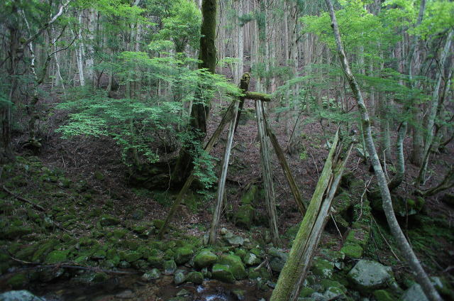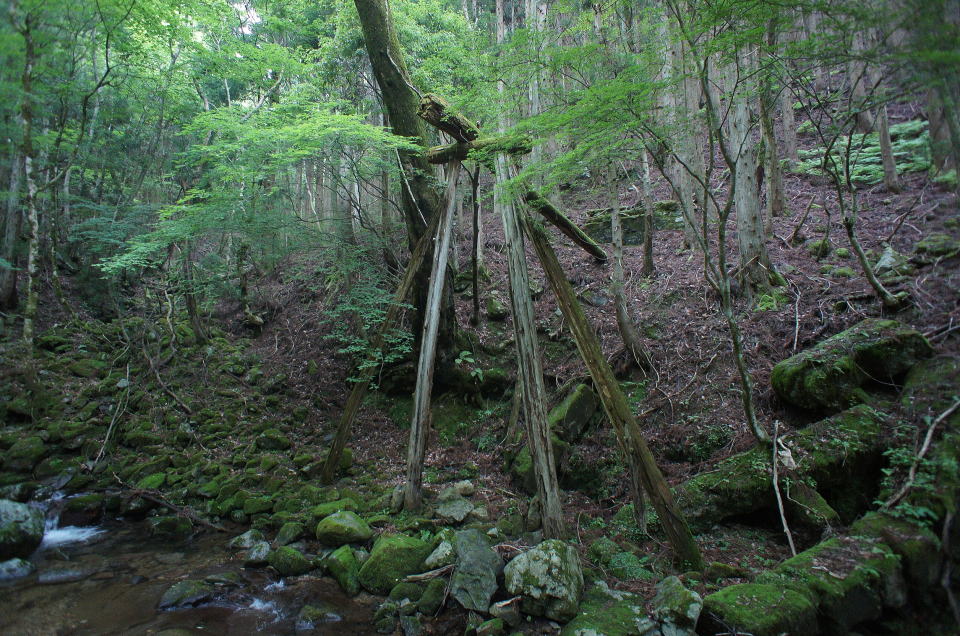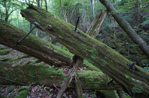 ![]() 屹立する丸太橋脚 2本の本柱に2本の支柱。横に這わせた短い丸太で橋脚と成す。 そこに奥のコンクリ橋台から這わせていたであろう丸太が一本乗っかっています。往時は2本以上乗っていたものと思われます。 |