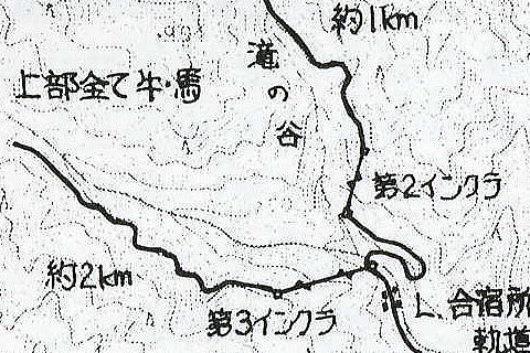 そのヒントがこの林鉄の軌跡の地図にありまし た。 第2インクラや第3インクラは帰ってから知ったの で、ここでは触れません。 第3インクラの付け根付近で川を渡りつつ180度 転回しているのが分かります。 この渡ってるのが3径間橋梁と思われます。 初代の橋梁が存在していたとすると、第2インク ラが嘗ては下まで伸びていて、接続していた(た だしそれだとインクラが滝の谷を横断することにな ります。) 或は第3インクラ方面の谷を俎上する軌道が あった、或は作ろうとしていた、という可能性も あります。(ただ、これもすぐ上流に滝があるので 困難かも…) まあこればっかりはもうちょっと細かく調査しない と判断しかねます。 どちらにしても、3径間橋梁渡ってからこんな スプーンを描いて第2インクラに接続しているとは 思いませんでした。 もうちょっと追いかけてみたらよかった、と後悔 しとります。 |
