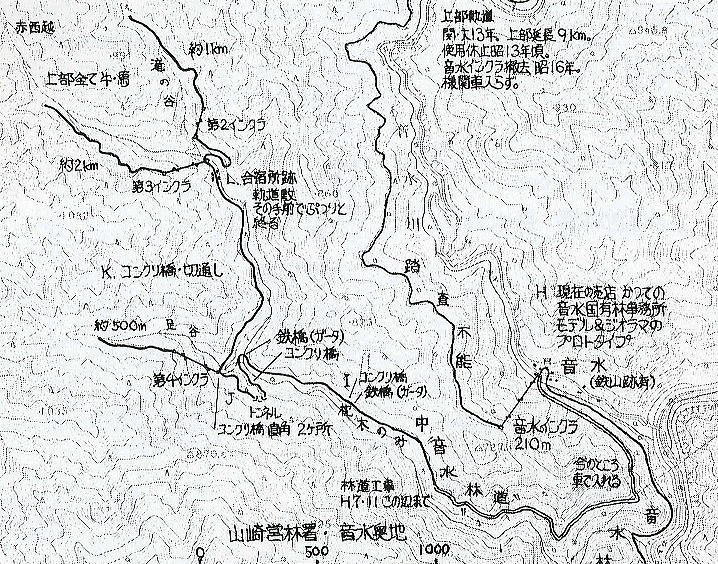 ![]() これまでの地図は全て著書「林鉄の軌跡」からの抜粋です。 かなり詳細な情報が記されており、ほぼこの通りの軌跡を描いているものと思われます。 帰りはL.合宿所跡から中音水川の東岸に渡り、道があるようなないような川沿いを下ると、最初に中音水川を渡る鉄橋 (ガーダー)の場所にショートカットできます。 地図ではそうでもないですが、実際に歩くとかなりのショートカットが実感できました。 機会があればもう一度奥地を見てみたいと思います。 中音水篇 取り敢えず 完 |