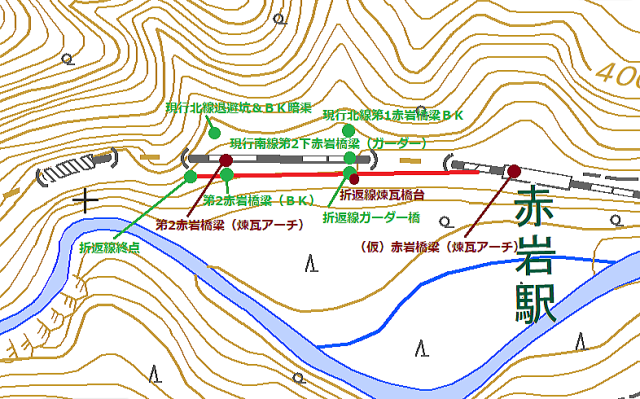 おや?奥行きがありませんね。 残念ながら全改修されているようで、煉瓦の姿 はありません。 幸い銘板があります。 ![]() 「第2赤岩(折返線)橋りょう」 とあります。 先程のガーダー橋の箇所、北側現行線では第1 赤岩橋梁とありましたので、これが並び的に一致 しますね。南側現行線の名称、第2下赤岩橋梁の 名称は、北側からの順番で第2、北側上流に対し て下流の南側を下赤岩にしたんではないでしょう か。推測ですが。 |