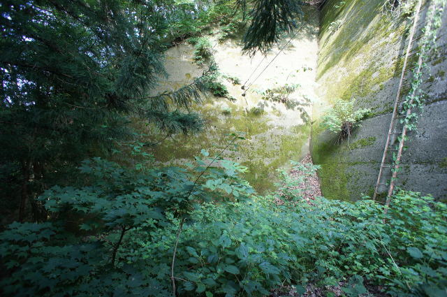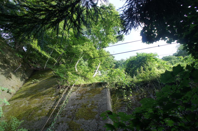アーチになっている! しかもコンクリアーチの奥にギリ煉瓦が見えてい るではありませんか!!! しかも…これって… "斜め"になってませんか?! 斜め=ねじりまんぽ???! そんなアホな…全身に鳥肌が立ちます。ヤバ い…ヤバすぎるぞこの物件!!! 何としてもあそこに行かなくては! しかしどうやってあそこまで…このほぼ垂直の壁 は登れんぞ、いくらなんでも… |