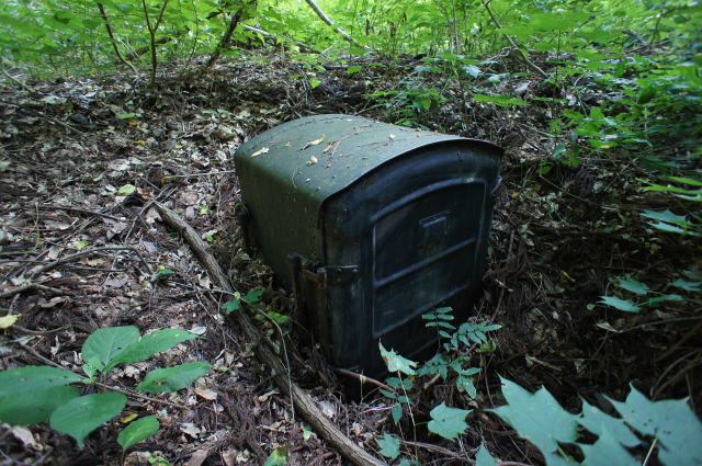 終点に遺された鉄道設備。 往時は立派に活躍していたんだとは思います が、今や埋まりかけています。 …で…国土地理院地図ではもう1ヶ所ポイントが あったんですが、ここまでその雰囲気はありませ んでした。うーん…ないんかな…? 念のため、折り返し線の外側を歩いて引き返す ことにします。 …すると… |