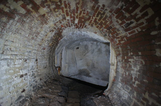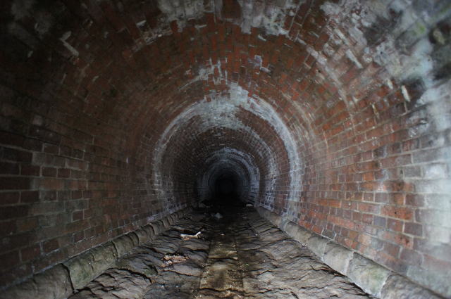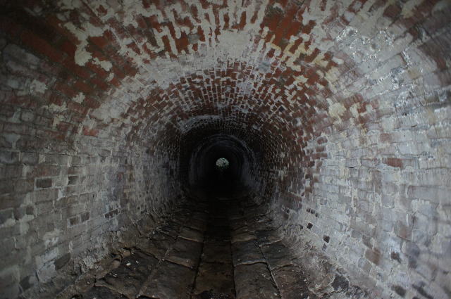 ねじりまんぽではありませんが、非常に美麗な 洞内です。いつもの半円ではなく、円形になってい ます。インバートは切石、煉瓦との接合部も切石 を使用しており、非常に精緻な造りです。 極めて丁寧な仕事をされています。こんな水路 によくぞ… |