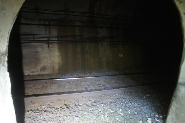 逸る心を抑えつつ、先に現行路線北側の様子を 見てみます。 本来なら僅かに明かり区間になるだろう北側現 行路線。そこをシェッドにしてトンネルとして一続き にしている模様です。 下の穴は水路暗渠、上の穴は退避坑ではない でしょうか。 |