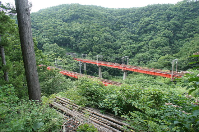この道は松川橋梁の傍まで続いていました。 見えている2本の赤い鉄橋が、3代目、4代目の 松川橋梁らしいです。 真ん中に煉瓦橋脚だけ残る2代目松川橋梁が あります。 あろうことか、何故かここはスルー…。しまっ た…。また見に来ないとな… ここからまた道を逸れ、左手に初代松川橋梁 方面に向かいます。 しかしちょっとルートミスをしたらしく、結構崩れ た斜面を横這いに進むハメに…。ここ、絶対アプ ローチポイントぢゃないよね…的な所をずりずり 無理矢理突破。 小尾根に合流すると、なんとなくの道筋を発見。 本来のアプローチポイントはもう少し上だったよう です。帰りにその道を辿ってみて、ああ、成程。 しかし初見でこのルートは取れないな、的な 箇所でした。 |