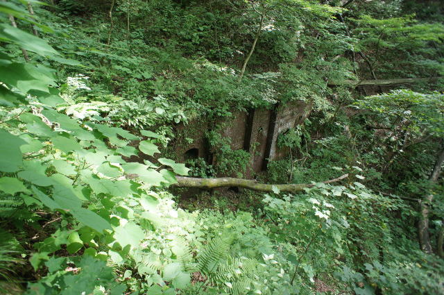 無事にアプローチルートに合流し、少し小尾根 を下って行くと… 出てきました!ネットでそのお姿を何度も見て いるその廃景をこの目に! ガッツポーズです。 しかしコレ、よく見つけたよな、最初の人…。 |