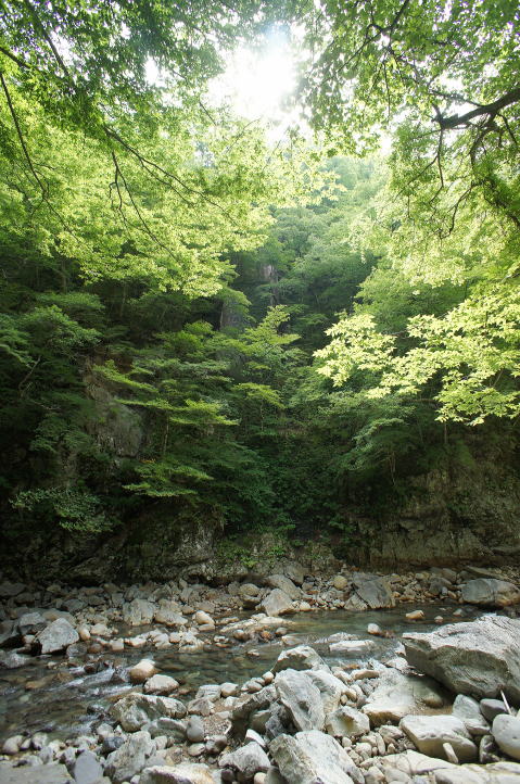 何とか川床に降り立ち、対岸を見上げます。 …うーむ… 崖の半ばになんちゅう構造物を造るのか… |