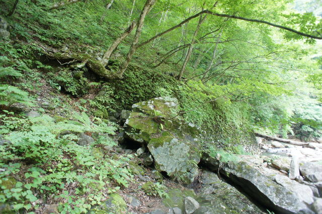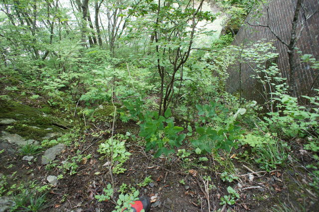 下流側は絶望的。上流側に行くと、ほんの少し 緩斜面が現れます。 ここにも石積み補強が見られます。 |