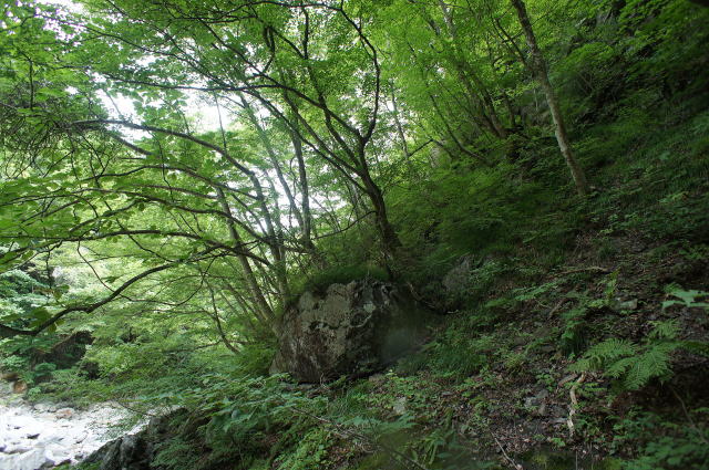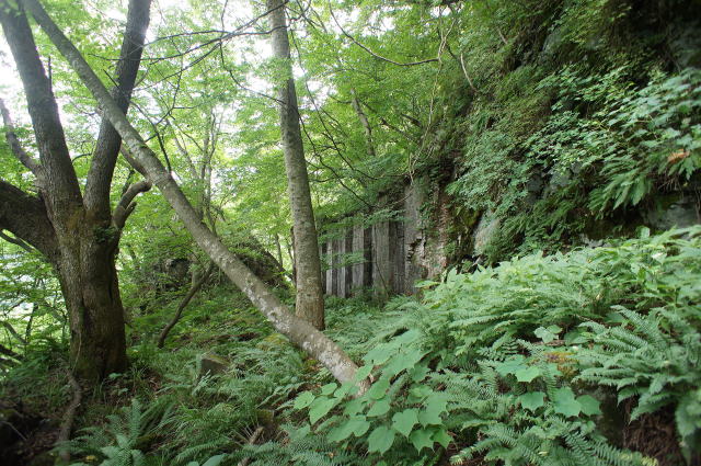 さて…と… 目を背けていたこのそそり立つ壁に対峙しな ければなりません。 見た感じ、この右手の岩場もかなりの急傾斜 です。ヨッキさんたちはここを登ったというの か…うーむ… 植生の生え方や岩場の状態を自分なりの経験 から分析したところ、何となくの道筋は見えまし た。 後はいかに慎重に一歩一歩踏み出すか、 です。 …よっしゃ… |